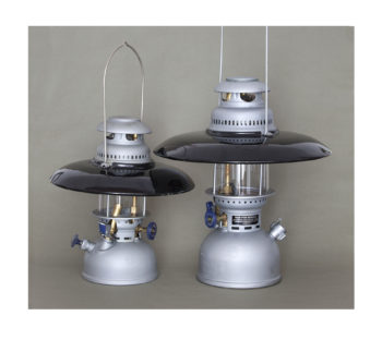 Petromax 250 und 500 der Bundeswehr mit gemarkten Schirmen, NOS, matt vernickelt, um 1960